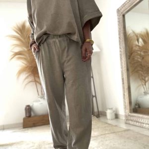 La blouse Barbara prune clair s’accorde à merveille avec le pantalon magique gris Nestor.