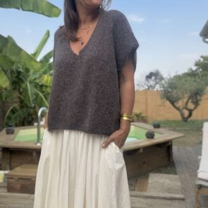 Elle se marie aussi parfaitement avec la jupe Flora camel, créant un contraste lumineux et raffiné.