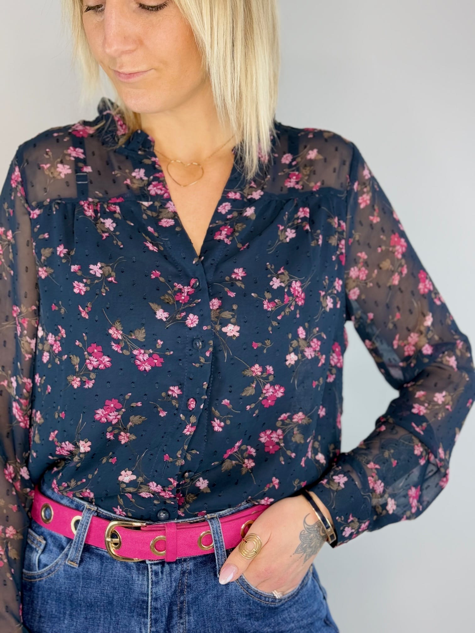 Ne passez pas à côté de ce chemisier floral bleu marine qui allie élégance et confort. Ajoutez-le à votre panier dès aujourd’hui et profitez de notre service de livraison rapide pour le recevoir chez vous en un rien de temps !