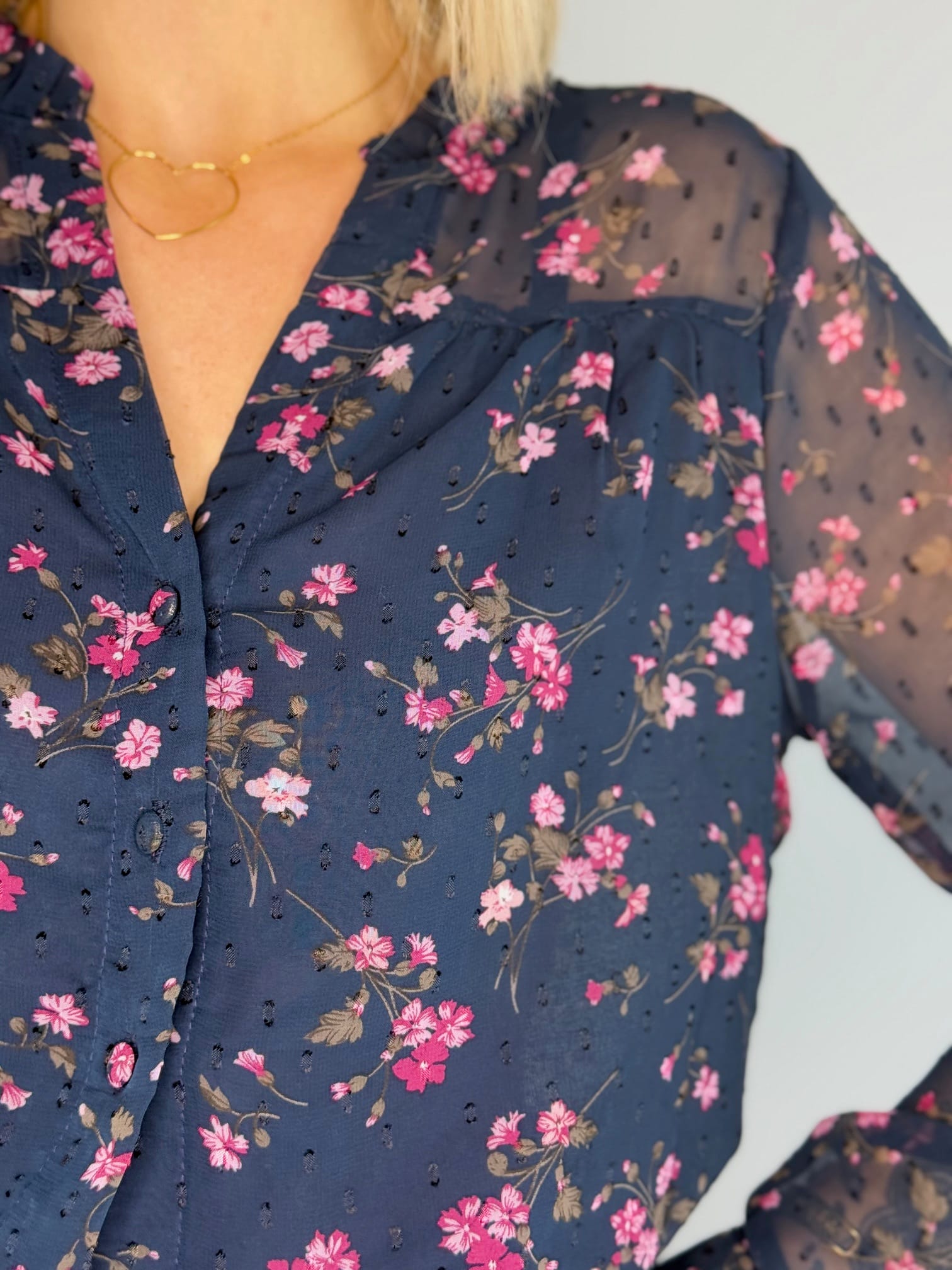 - Fond bleu marine agrémenté de petites fleurs roses, idéal pour illuminer votre tenue.