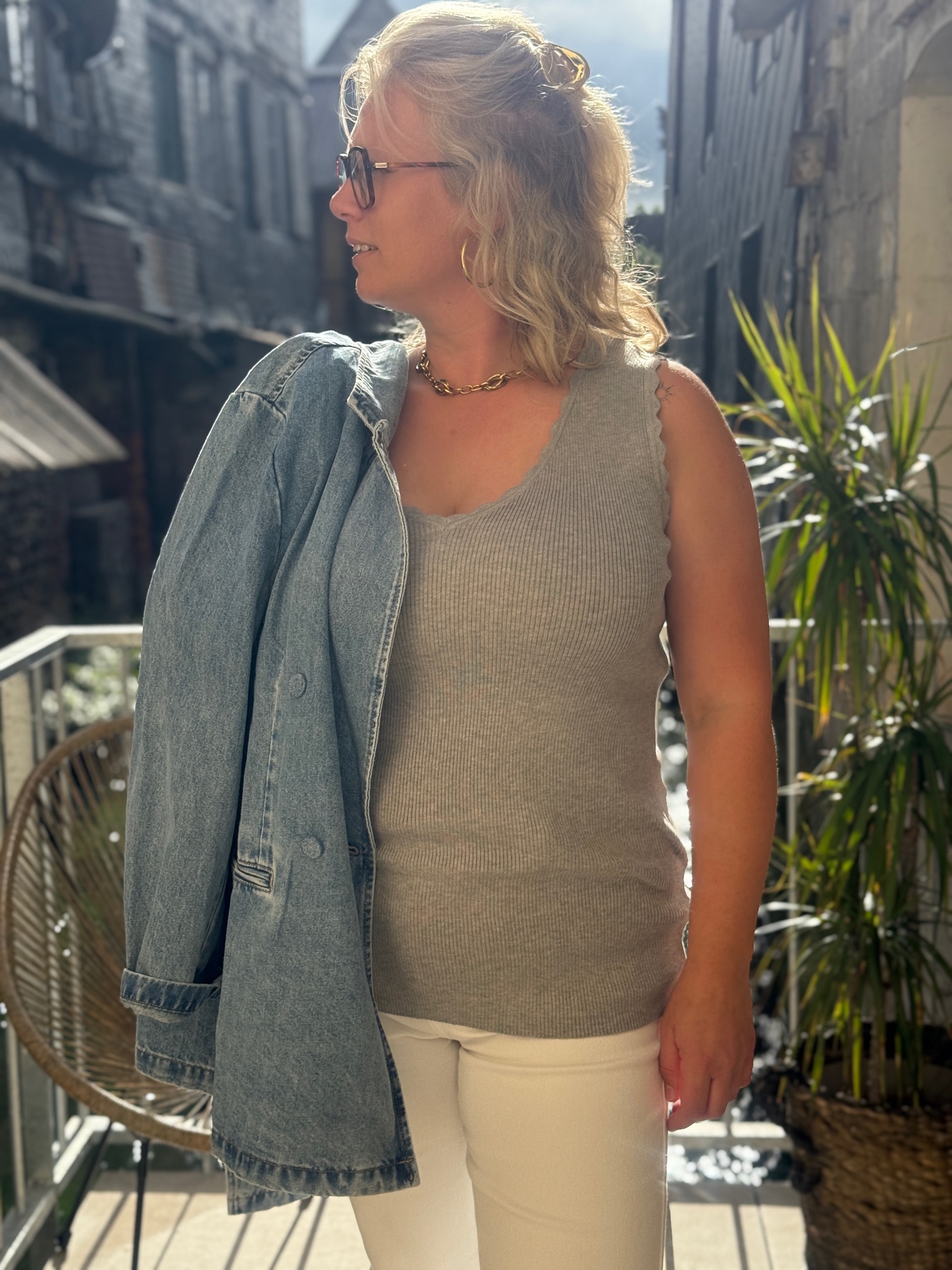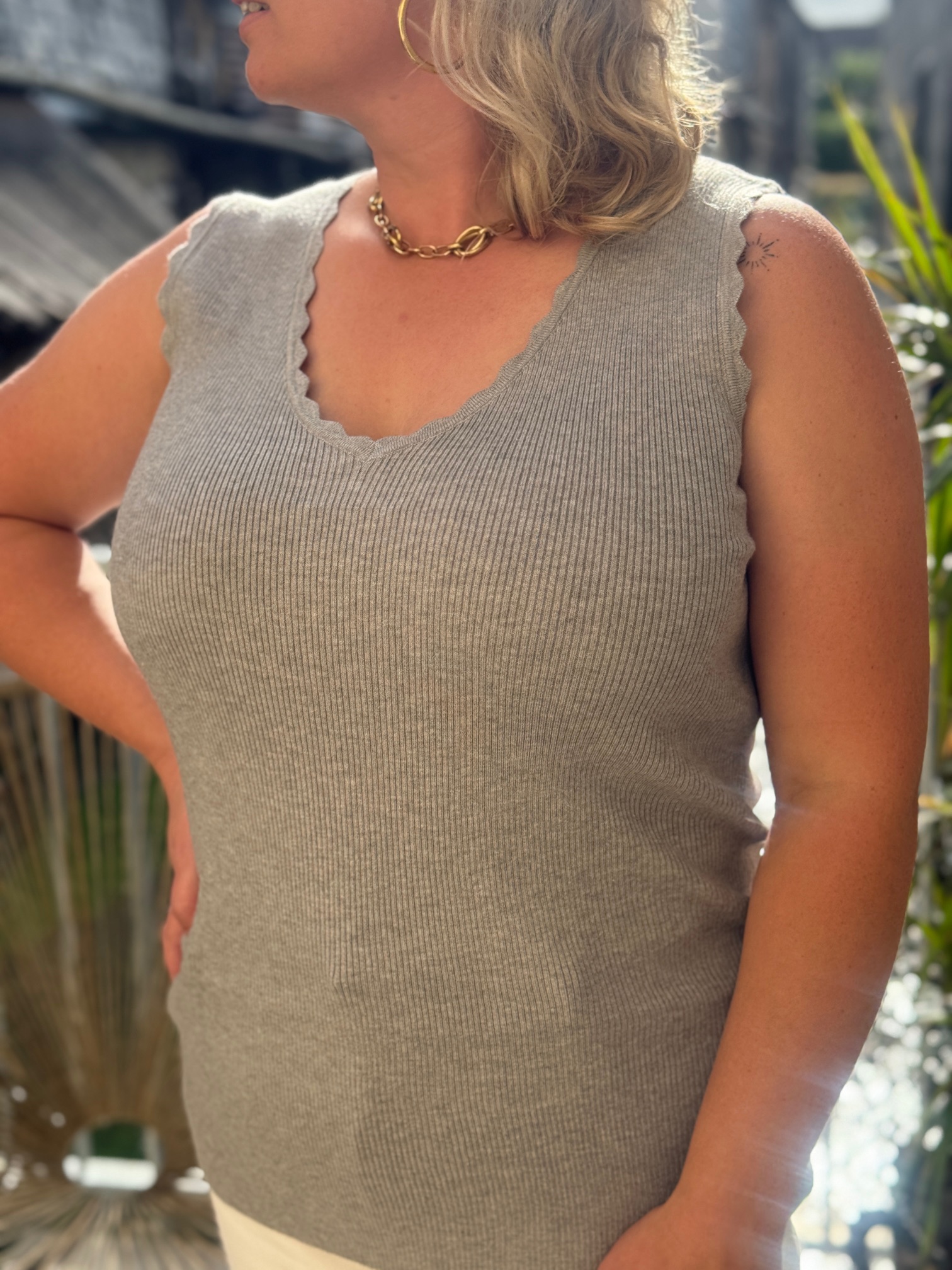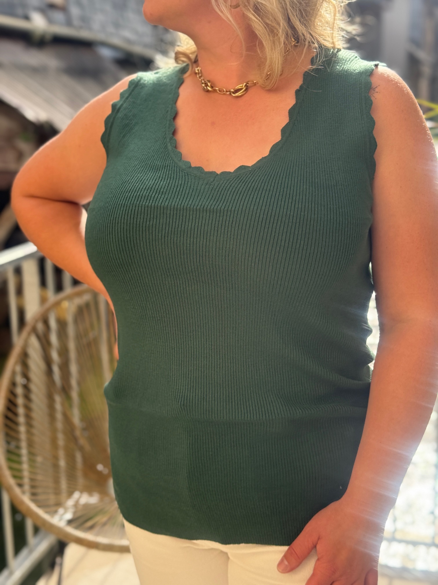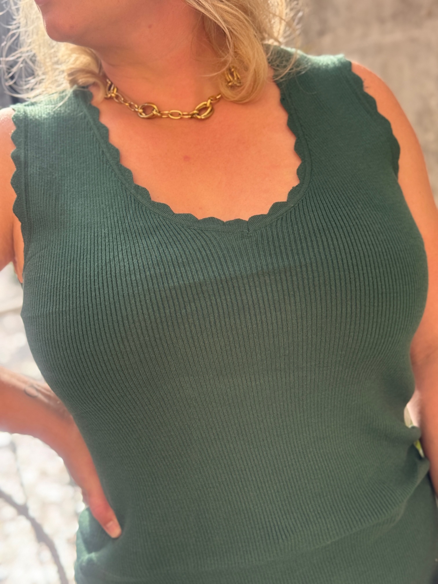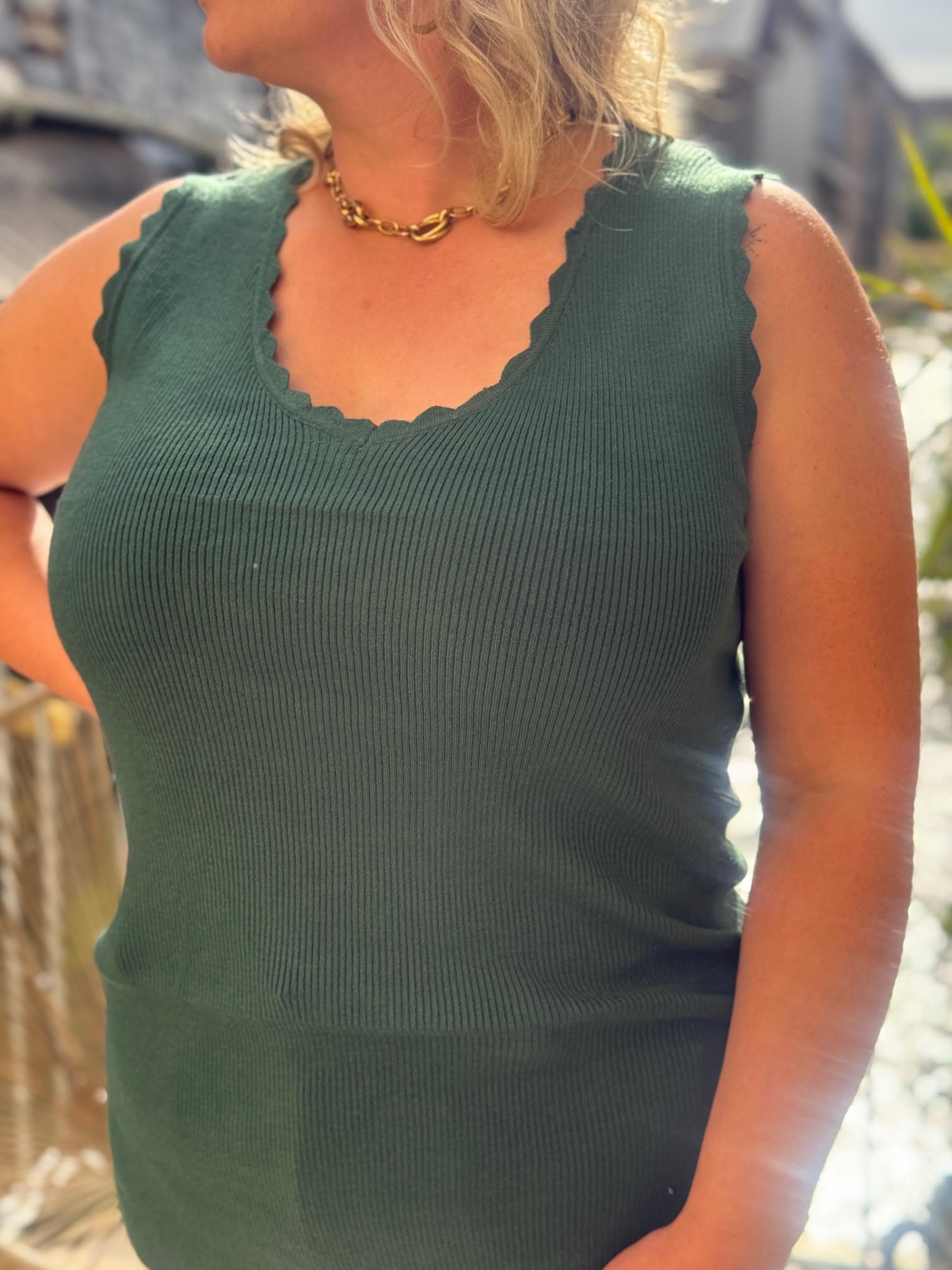 Ce débardeur se distingue par son col en V délicatement ondulé et sa maille côtelée qui épouse harmonieusement la silhouette sans comprimer. Disponible en plusieurs coloris (noir, gris clair, vert foncé), il s’adapte à tous les styles et toutes les envies.