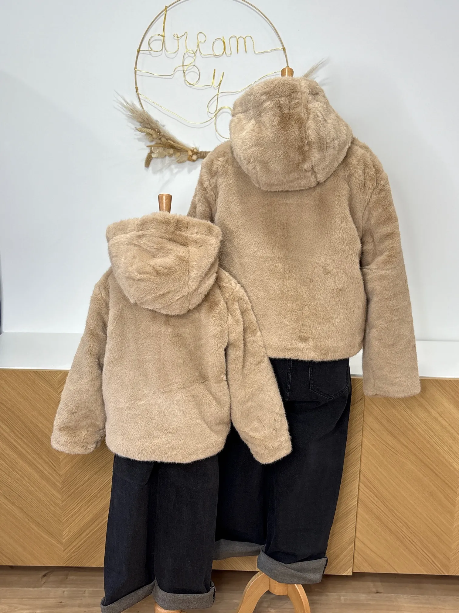Plongez dans la douceur absolue avec notre manteaux fausse fourrure avec capuche couleur taupe, une pièce phare de la collection Matchy-Matchy Dream By C.