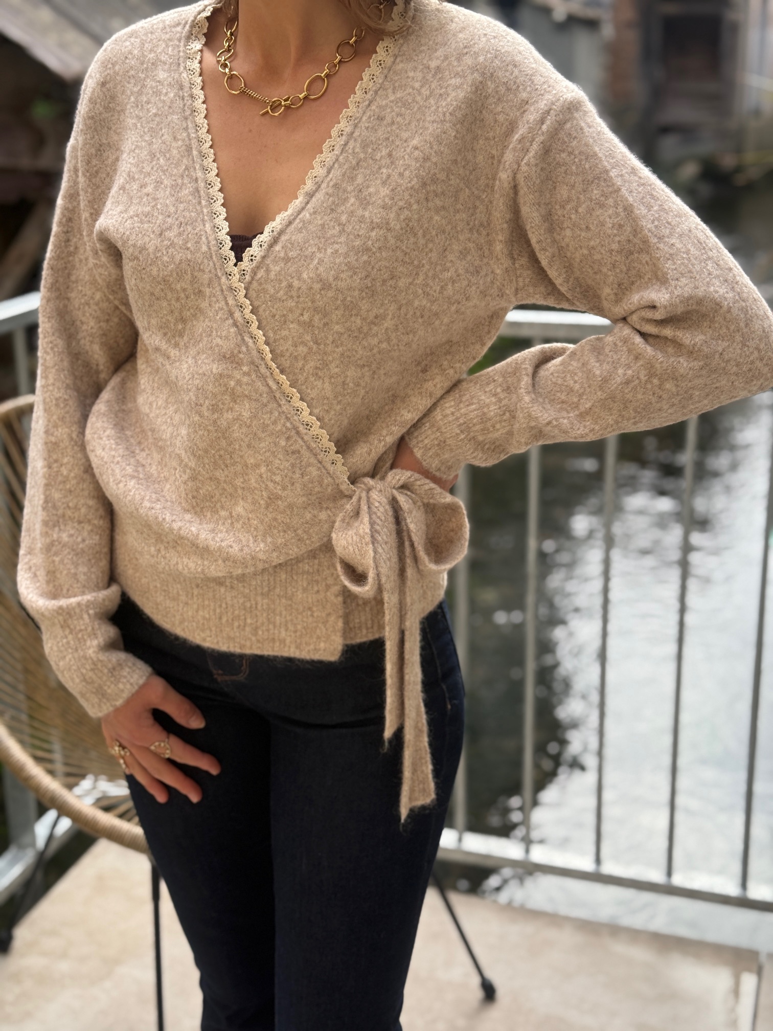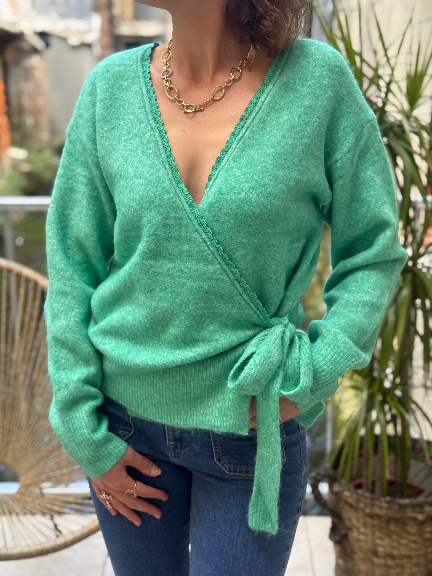 Le gilet cache cœur en maille associe élégance et confort. Avec ses manches longues, sa ceinture à nouer et ses détails brodés, il sublime vos tenues du quotidien.