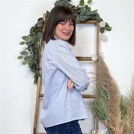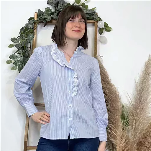 Ce chemisier rayé bleu et blanc est un véritable basique du vestiaire féminin, coupe droite, des manches longues et un col mao à volants. Touche d’originalité Maëlle : La marque apporte toujours une petite touche d’originalité à ses créations, comme la ligne de bouton centrale ornée de volants et de dentelle de votre chemisier, pour vous démarquer avec élégance.