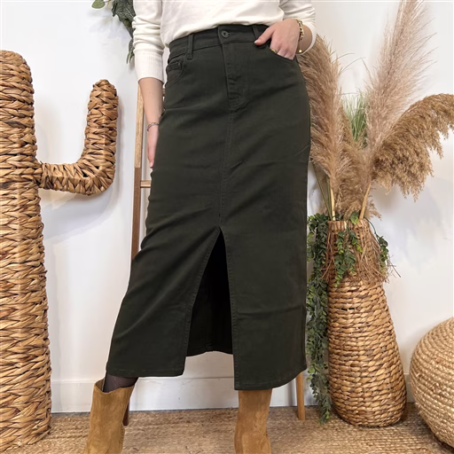 Cette jupe en jean Voggo est une pièce incontournable. Ce modèle se distingue par sa simplicité et ses rivets métalliques sur les poches. Une jupe longue femme fendue à la coupe très légèrement évasée, confectionnée dans une matière extensible ultra confortable. Cette jupe se porte aussi bien avec un T-shirt, ou une Blouse ou un pull quand les jours se rafraichissent. Vous connaissez les jeans Voggo by BleuClair, vous apprécierez la version jupe Voggo.