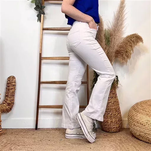 Ce jean Flare de la marque Voggo est fabriqué dans un tissu de qualité, coupe seventies avec ses 2 poches plaquées. Il est disponible dans une large gamme de tailles, de la 36 au 44. La coupe flare allonge la jambe et donne une silhouette élégante.2 poches plaquées de chaque côté des hanches sont une caractéristique distinctive de ce pantalon. Ils lui confèrent un style unique et raffiné. Ce pantalon peut être porté de différentes manières. Il peut être associé à une blouse ou un T-shirt pour une tenue décontractée ou à un pull ou un blazer pour une tenue plus habillée.