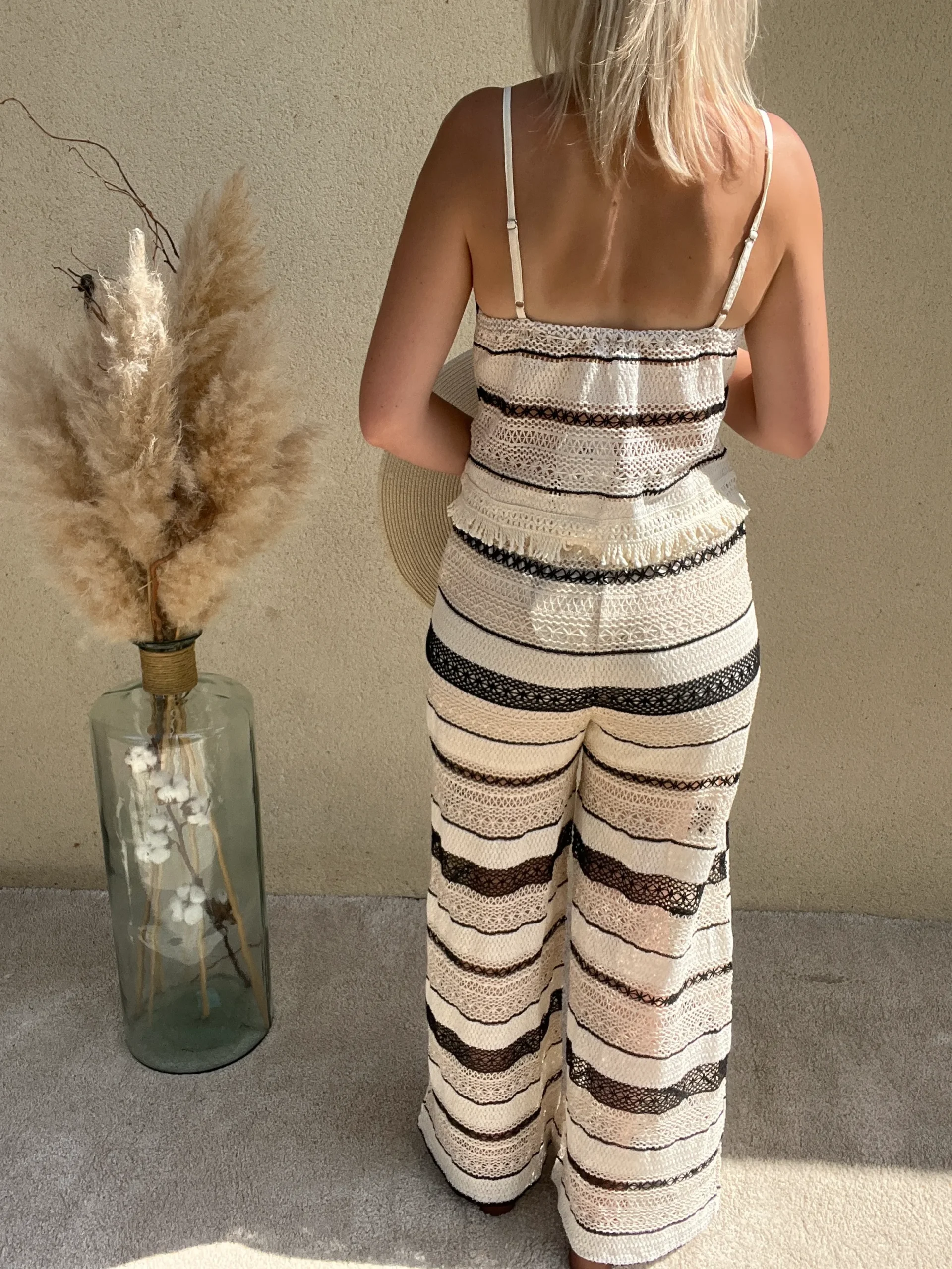 Optez pour le style estival raffiné avec notre pantalon en crochet Femme beige et noir de chez Dream By C.