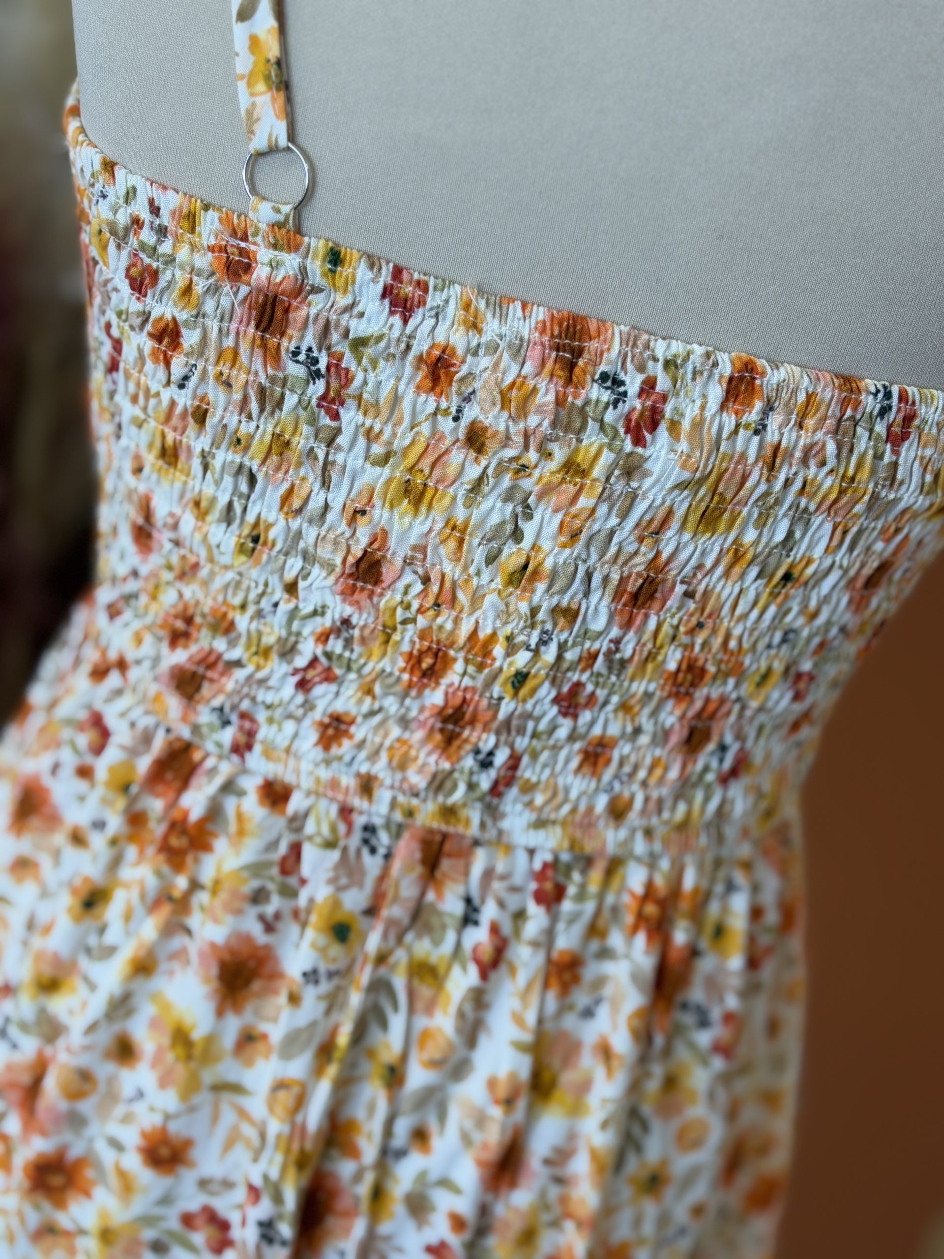 Cette robe présente un fond blanc parsemé de petites fleurs orange et jaune, comme une prairie en été. Le motif est discret mais joyeux, idéal pour illuminer votre teint et affirmer un look plein de fraîcheur.