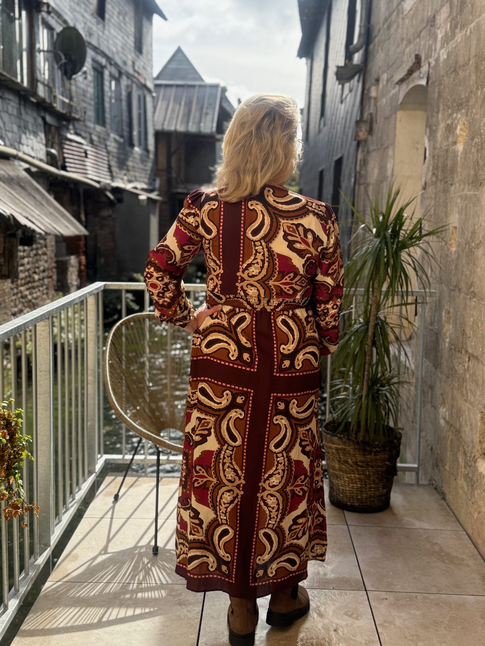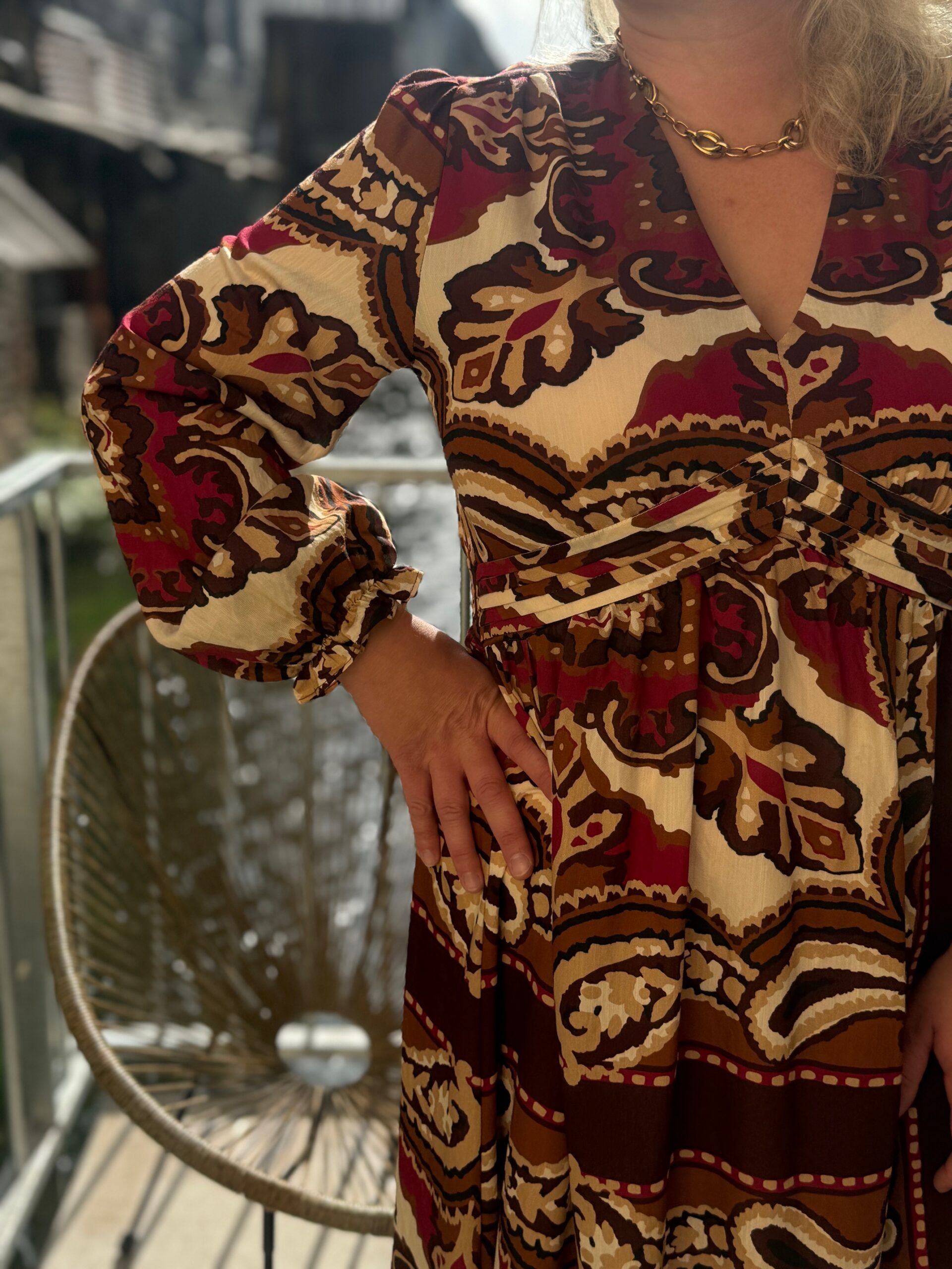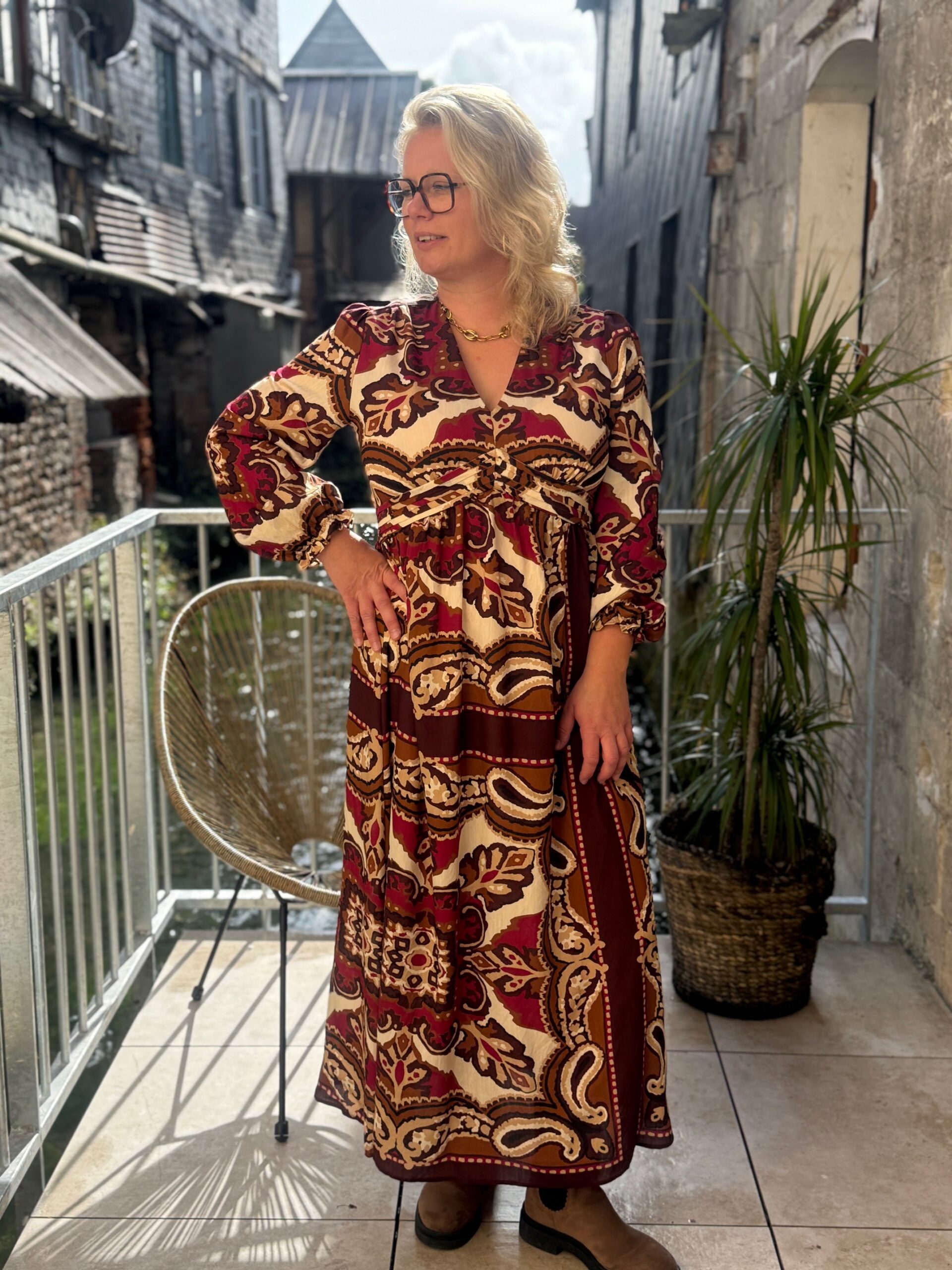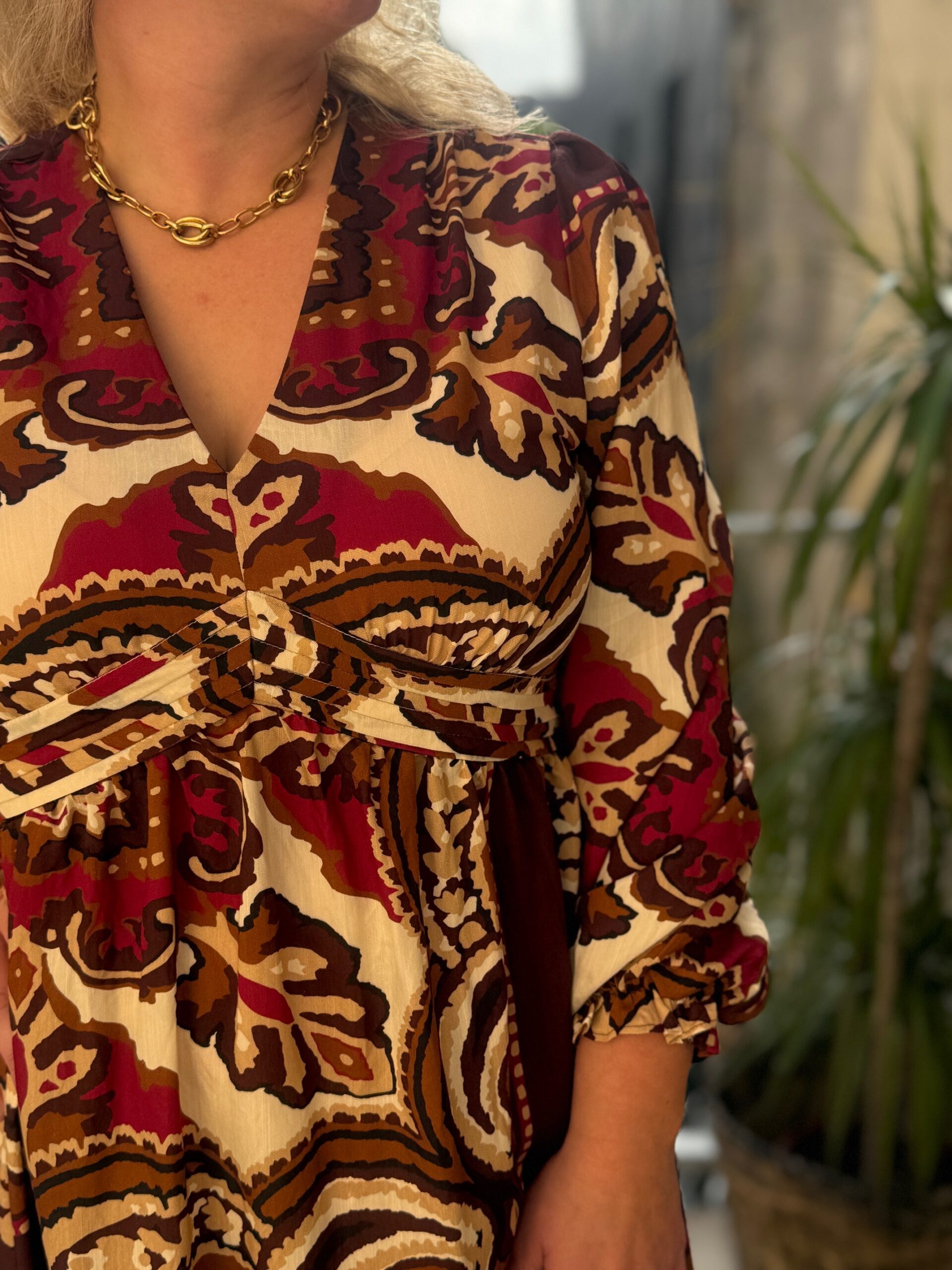 La robe grande taille longue Dream by C est une pièce phare de notre collection. Pensée pour les silhouettes pulpeuses, elle associe confort et raffinement grâce à sa coupe fluide et ses détails soignés. Ses couleurs chaudes en beige et bordeaux en font une tenue idéale pour toutes les occasions.