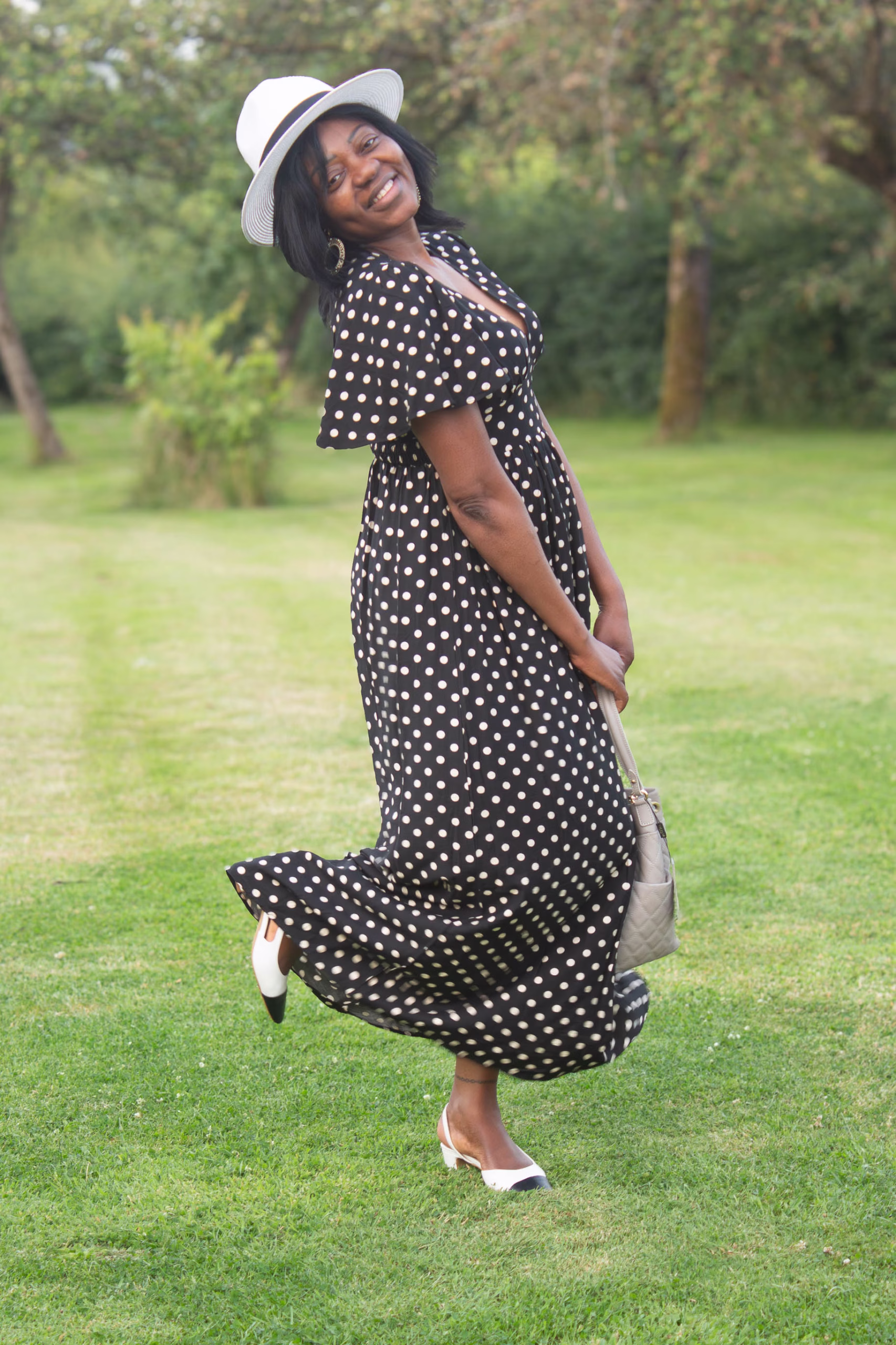 Robe longue imprimée a pois , découpe en pie a la taille , bas évasé