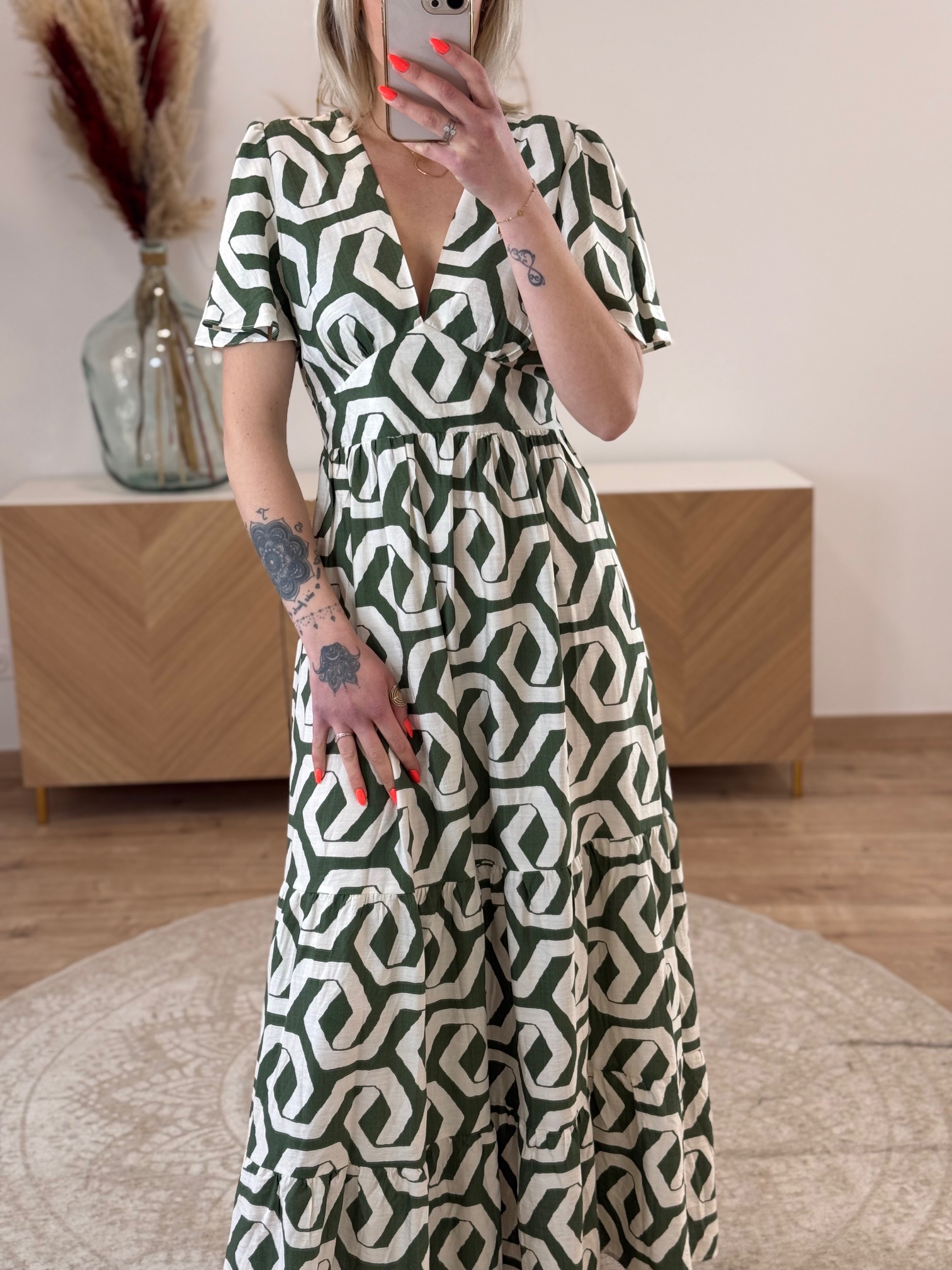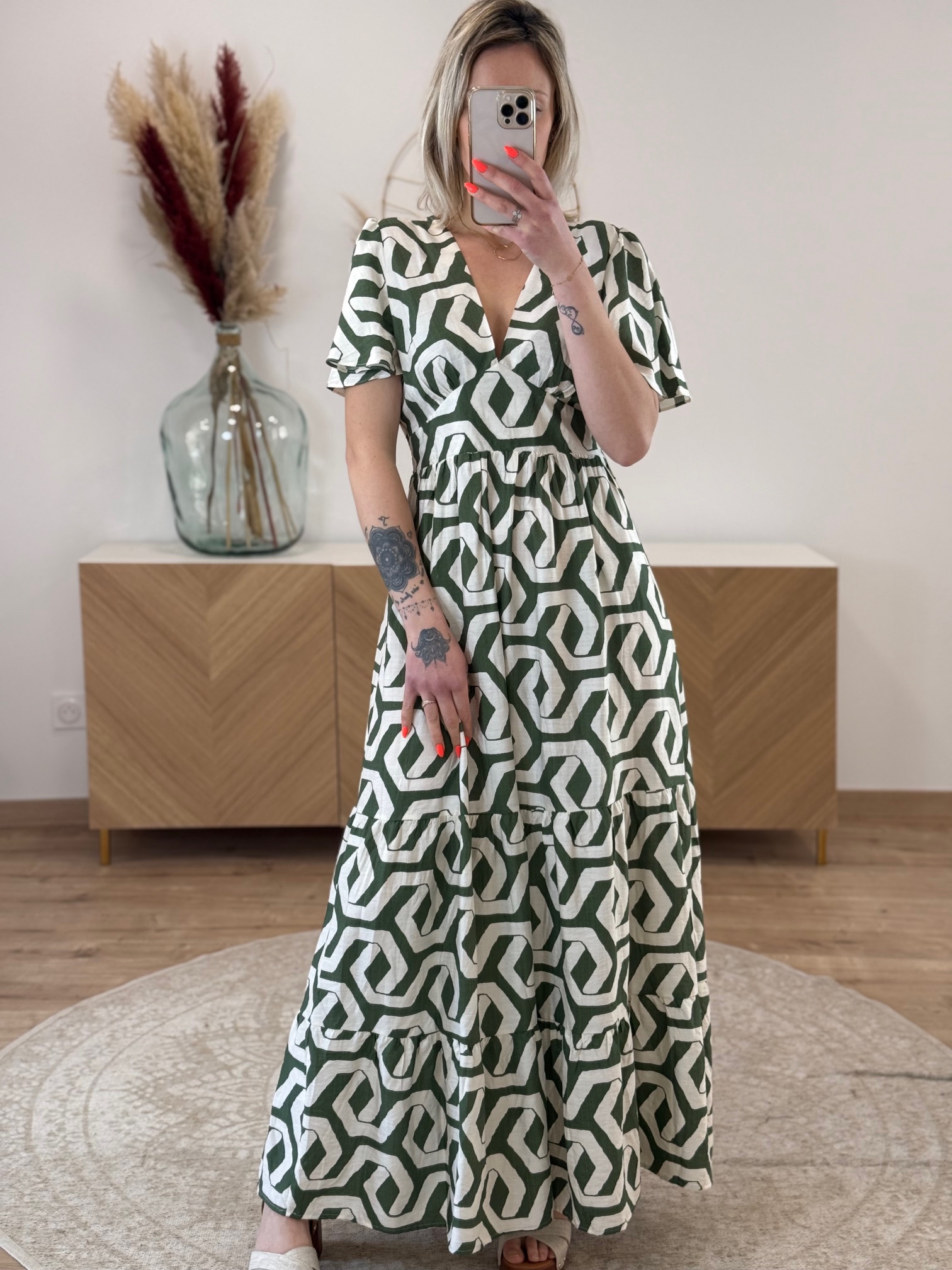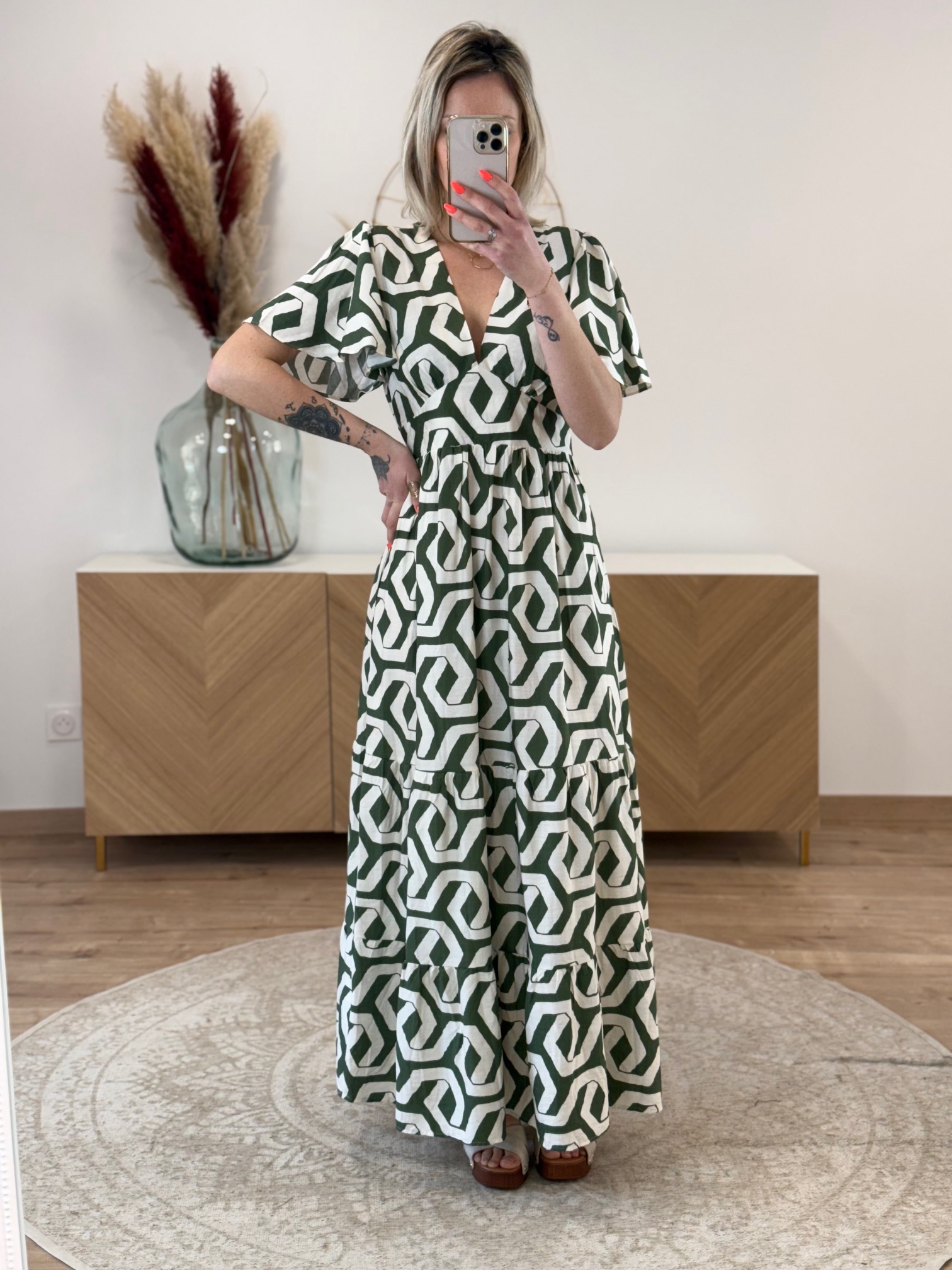 Robe longue kaki femme à imprimé écru, col V devant et dos, manches volantées, volant en bas. Tailles S/M et M/L. À découvrir sur Dream By C.