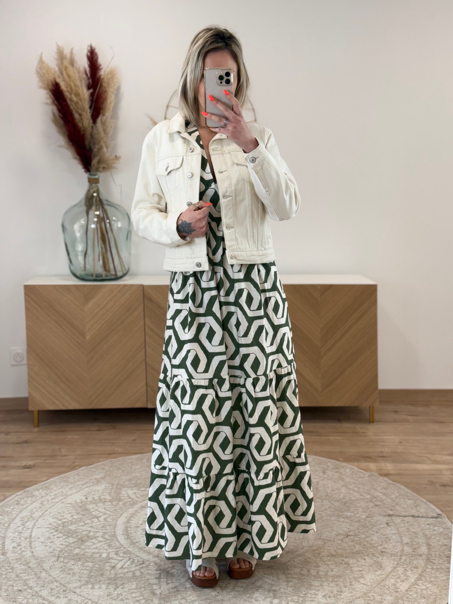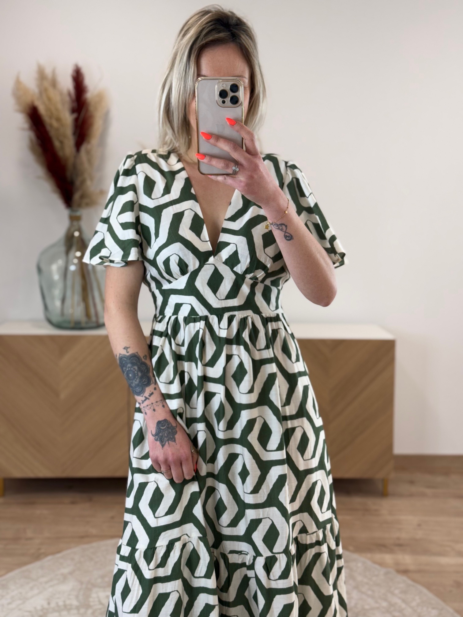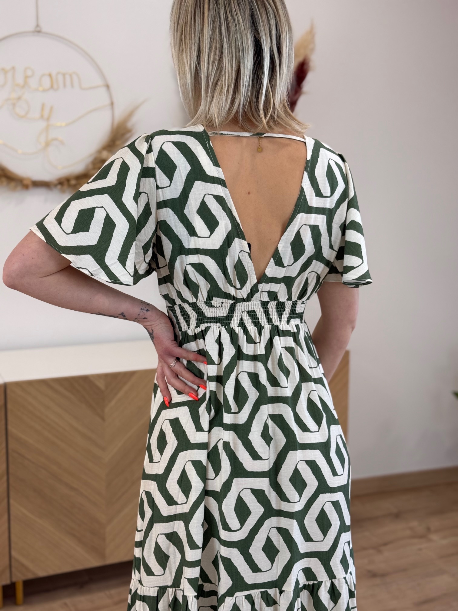 Robe longue kaki femme à imprimé écru, col V devant et dos, manches volantées, volant en bas. Tailles S/M et M/L. À découvrir sur Dream By C.