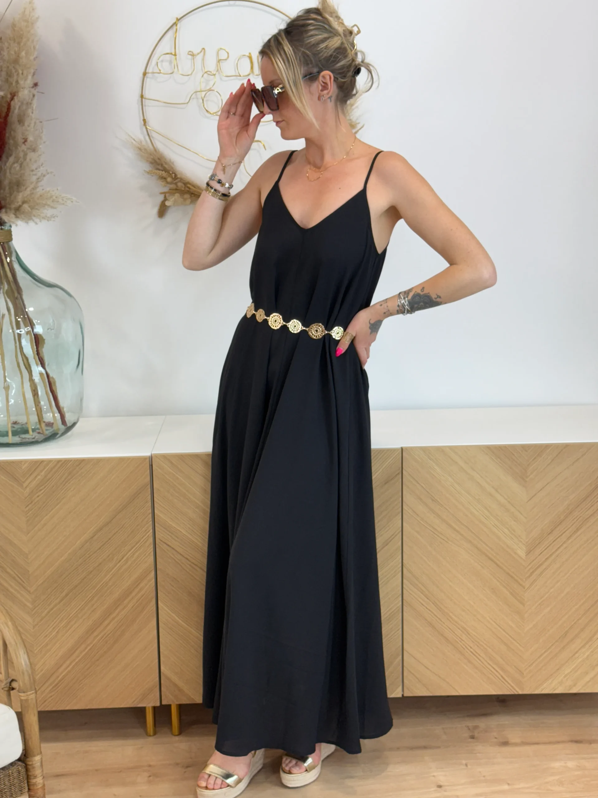 Optez pour un look chic et intemporel avec notre robe noire dos nu. Cette pièce longue et fluide, confectionnée en 100 % polyester, épouse les courbes avec légèreté. Son col V et ses fines bretelles réglables mettent en valeur votre silhouette, tandis que son dos nu ajoute une touche sensuelle subtile.
