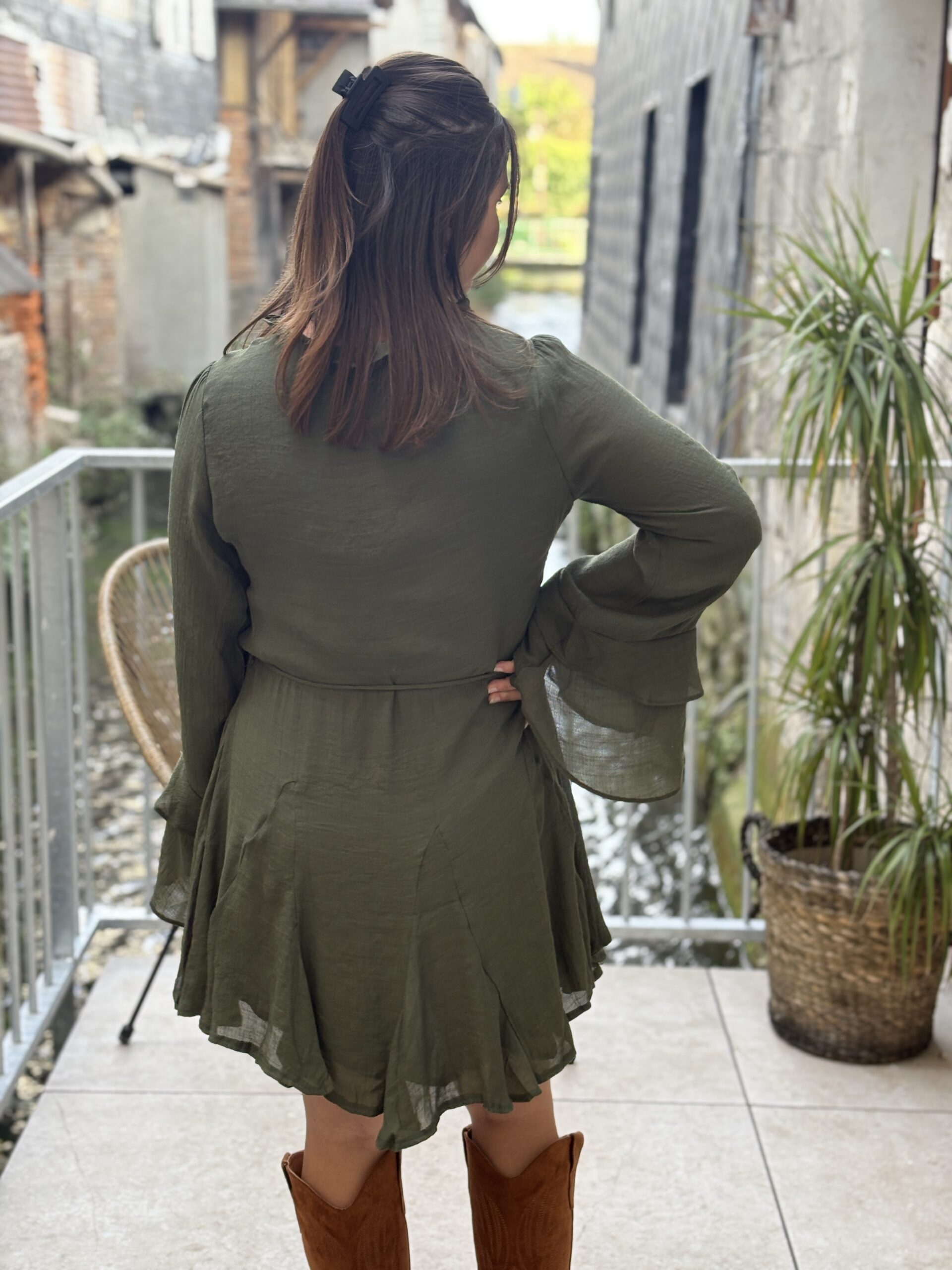 Cette robe patineuse kaki est une pièce incontournable du dressing féminin. Avec sa coupe évasée, ses finitions raffinées et sa couleur intemporelle, elle allie féminité et confort pour toutes vos occasions, du quotidien aux sorties habillées.
