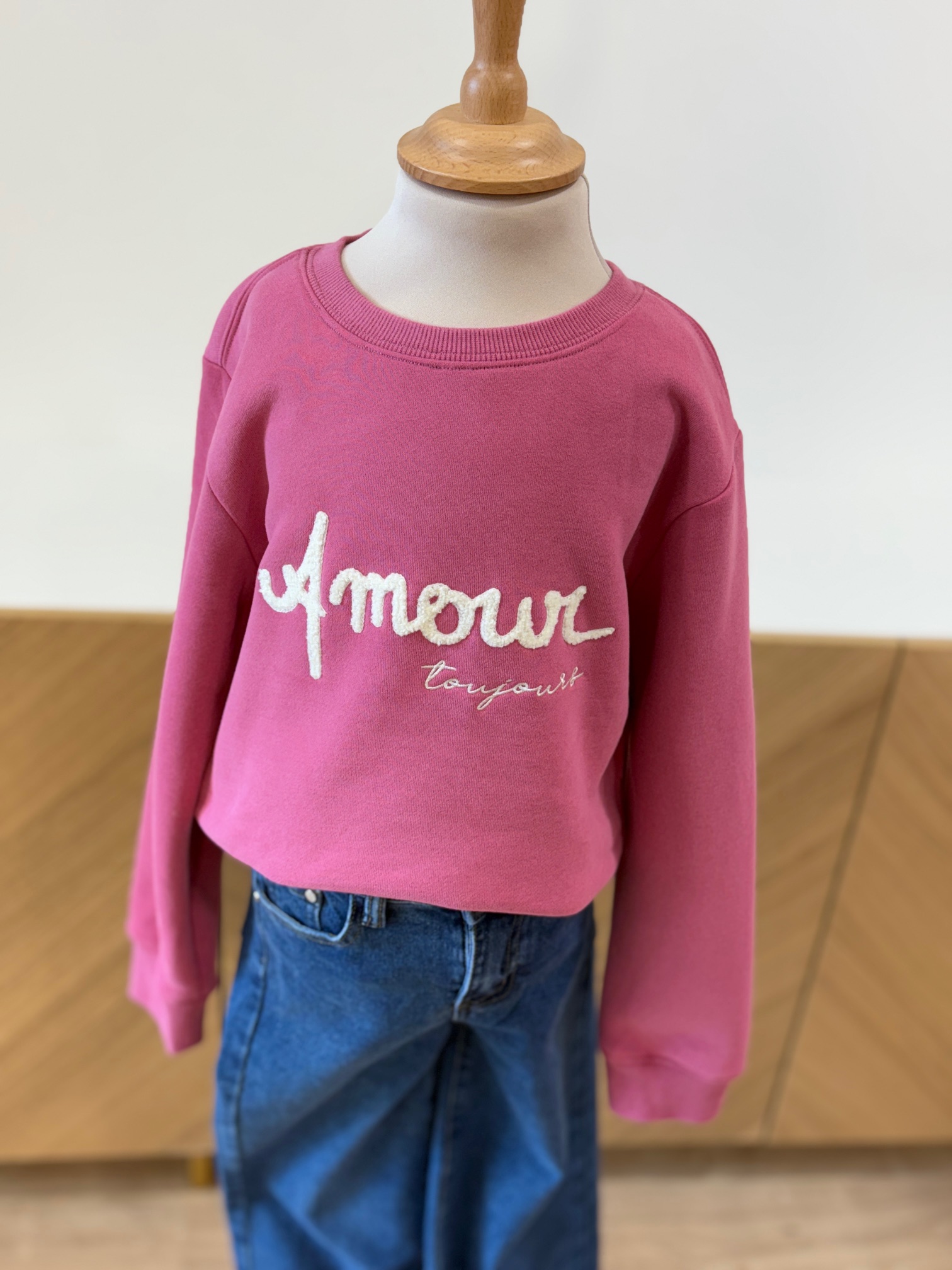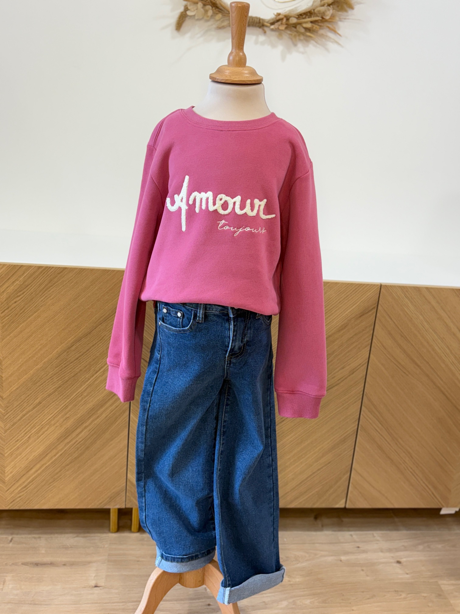 Le sweat rose fille se marie facilement avec un jean enfant, une jupe ou un pantalon en coton. Sa couleur framboise apporte une touche de pep’s et sa broderie « Amour Toujours » en fait une pièce symbolique et tendance.