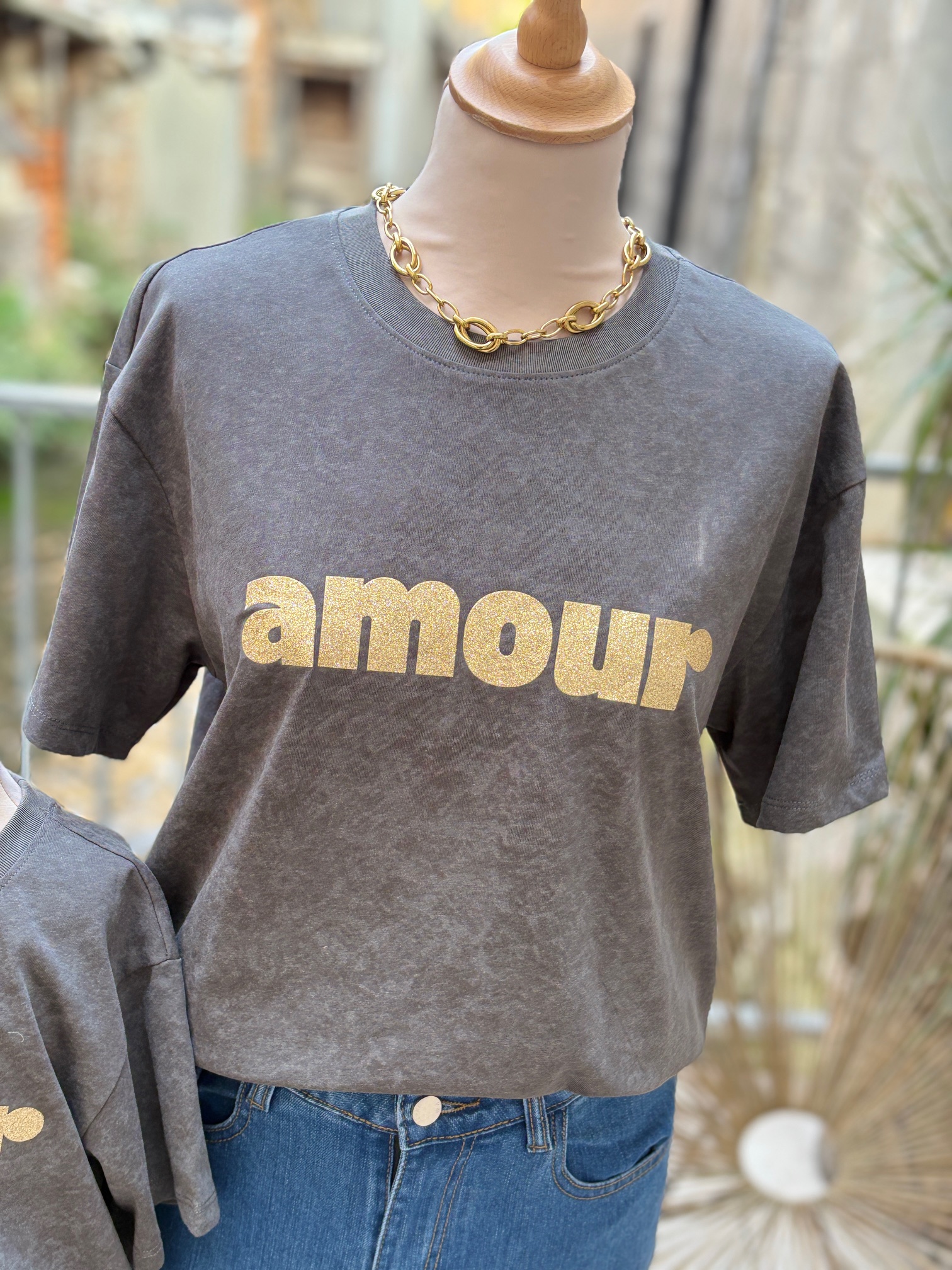 Ajoutez une touche chic à votre dressing avec notre tee shirt femme amour gris anthracite et doré. Réalisé en 100 % coton, il offre confort, douceur et respirabilité. Son inscription « amour » en paillettes dorées illumine vos tenues, tout en apportant un style moderne et raffiné.