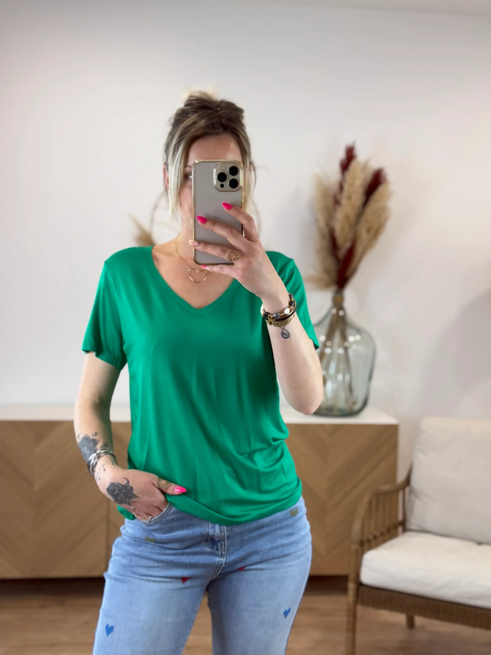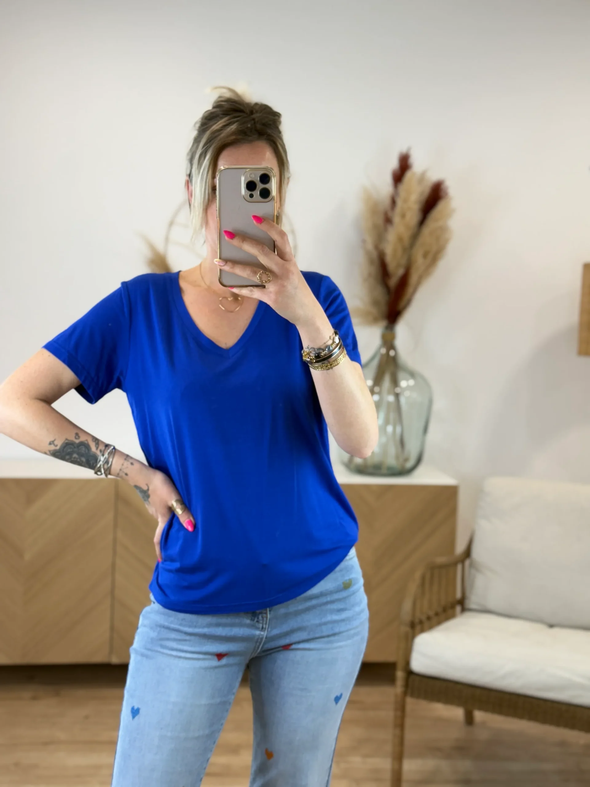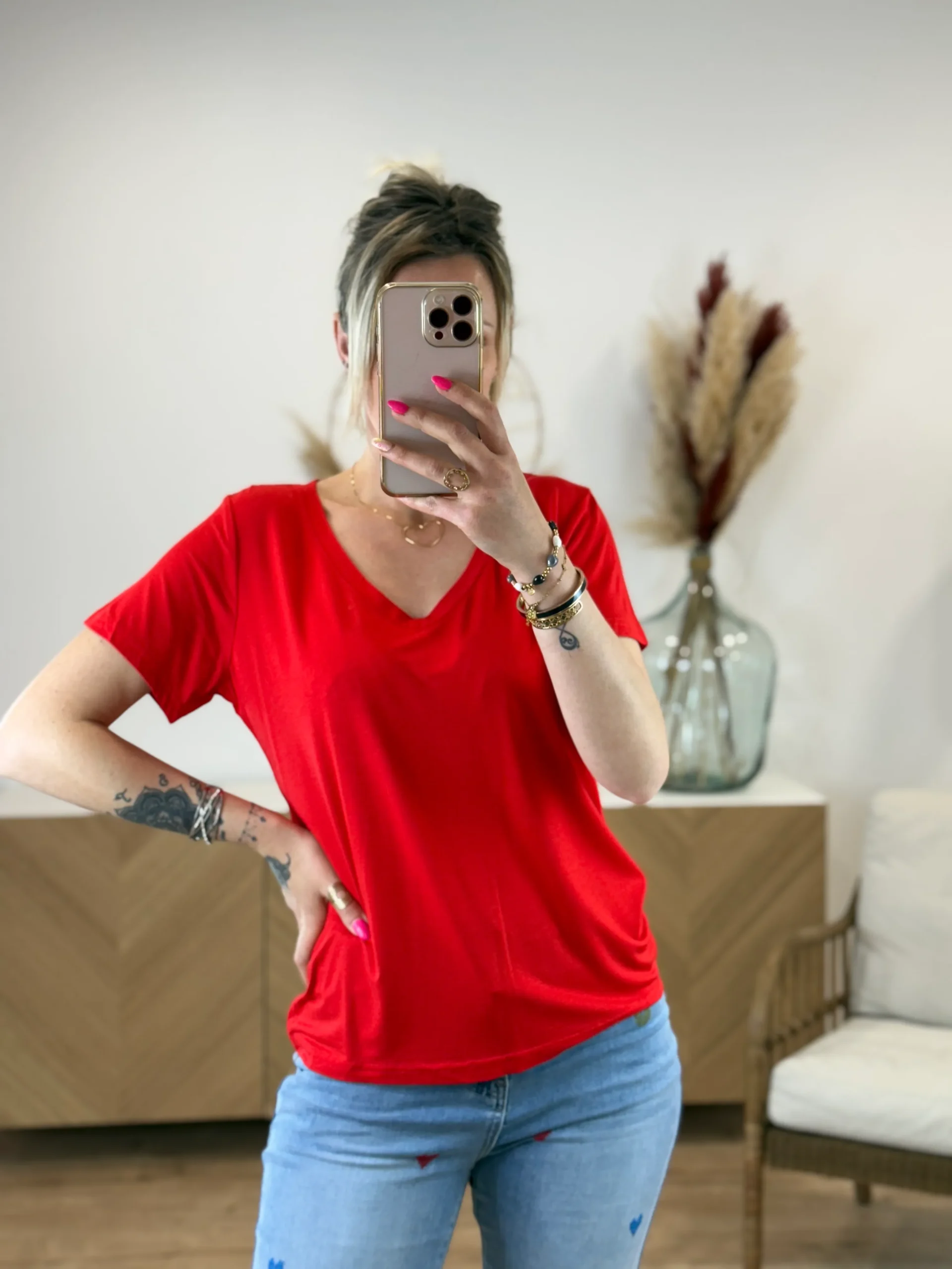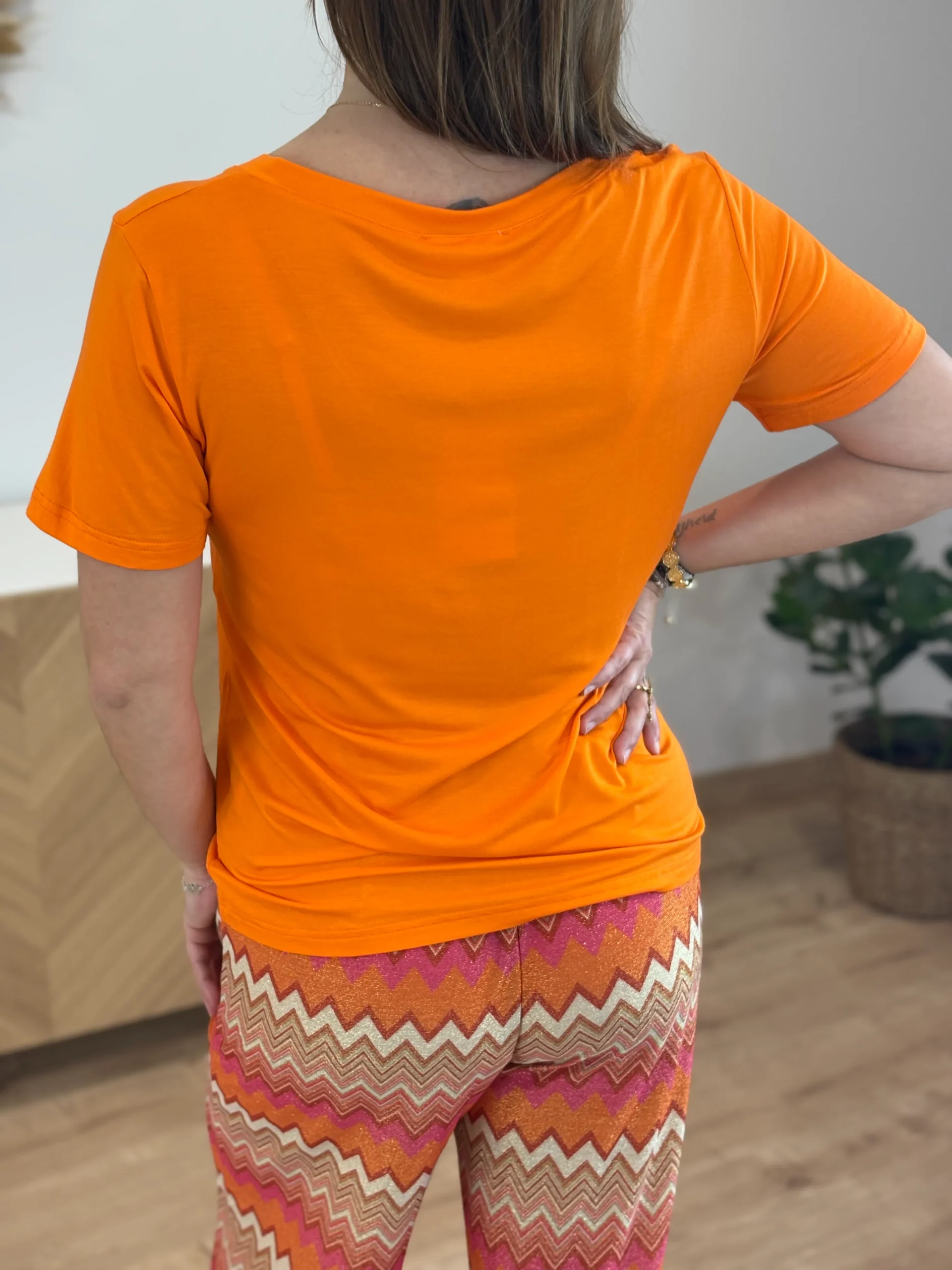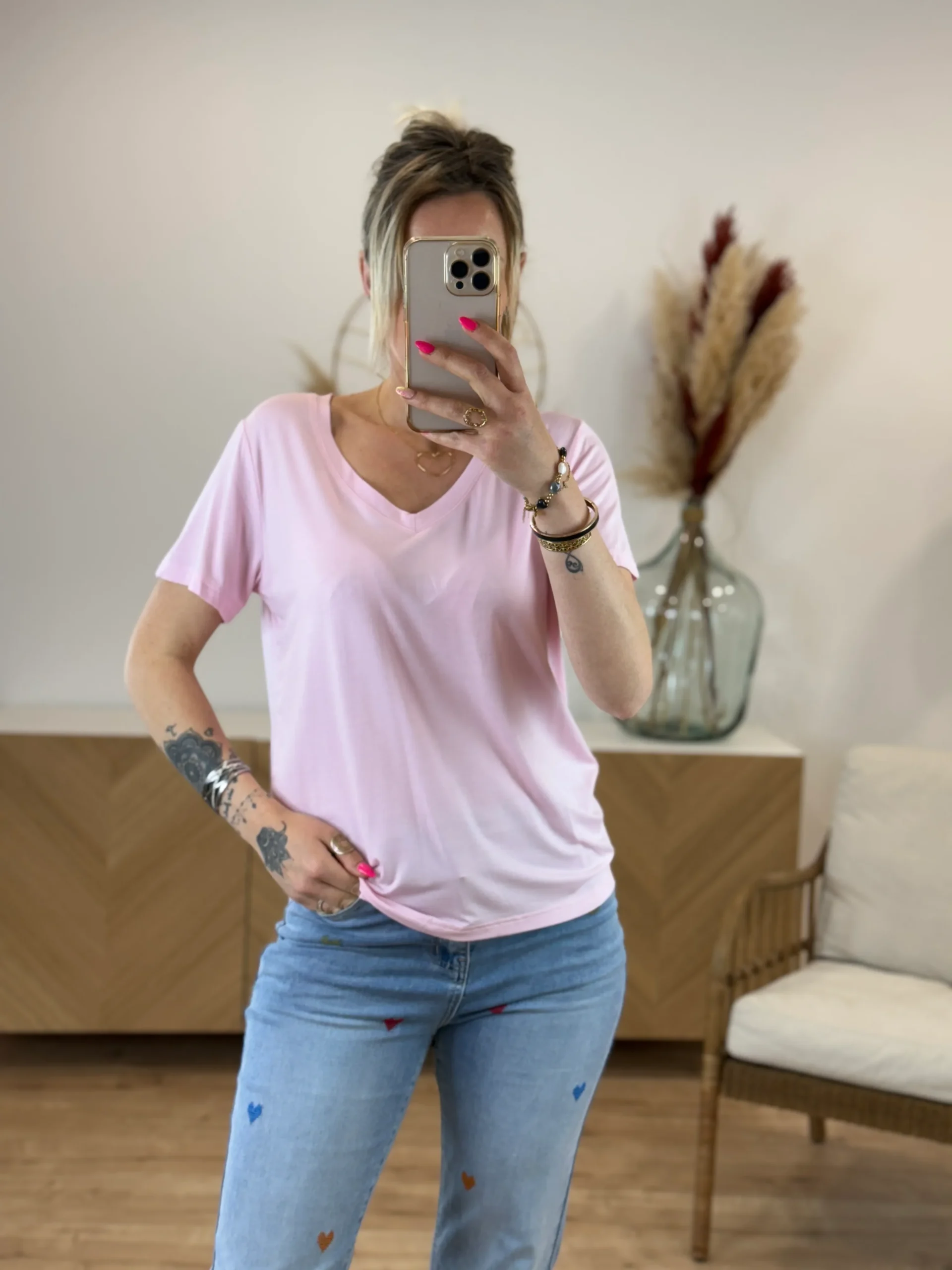 T-shirt couleur uni col V fluide en viscose. Confort ultime. Disponible en 7 coloris et 2 tailles (S/M – M/L). Léger, doux et polyvalent.