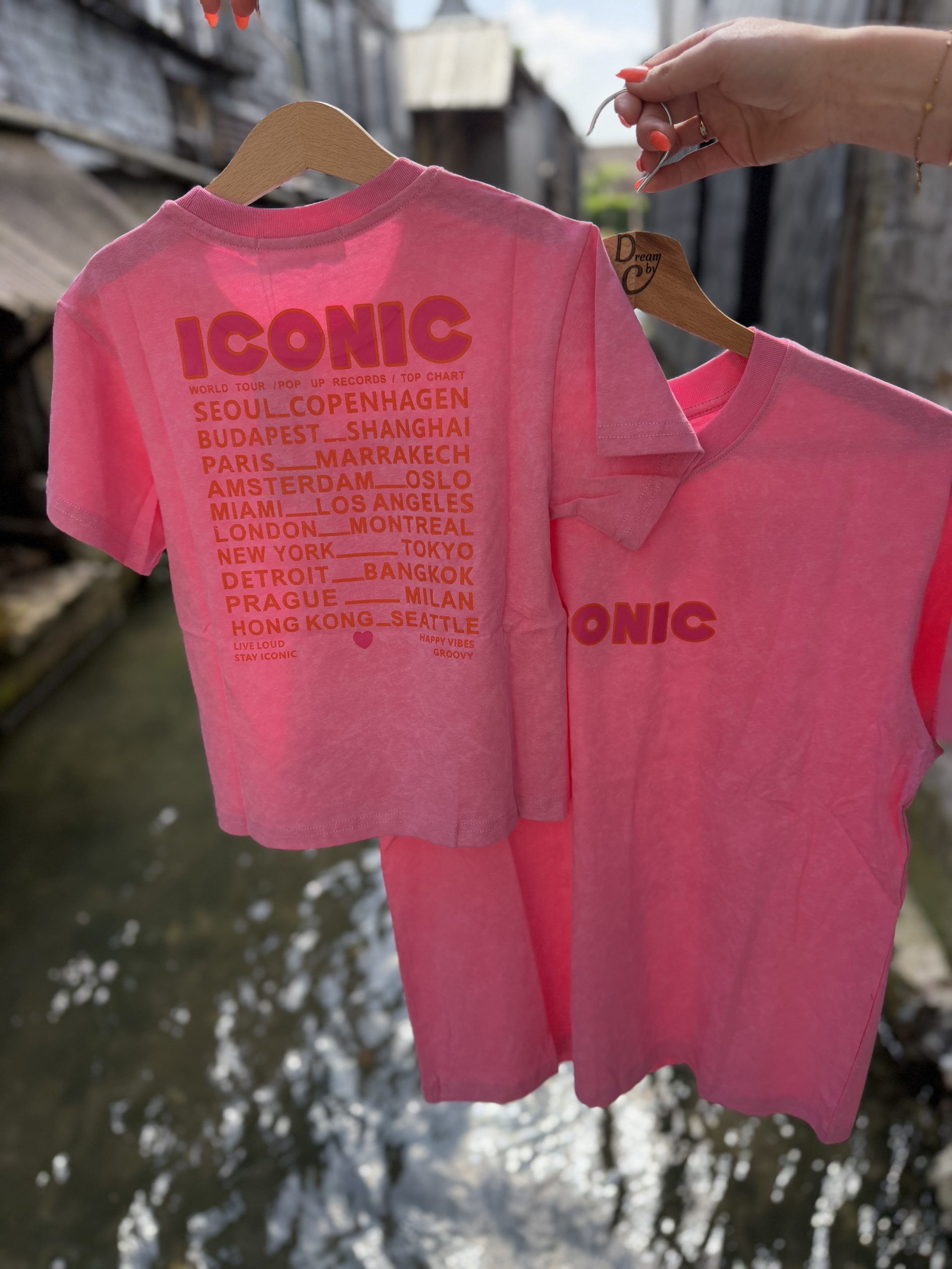 Imprimés : poitrine « Iconic » rose + grand motif dos avec villes en orange