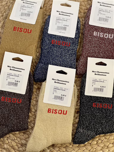 « BISOU ». Un joli PATCH pour ces chaussettes à paillettes à message proposées en tailles unique convenant de la taille taille 35 au 41. Fantaisies et stylées de la marque. Pour faire un cadeau, ou pour vous même… elles vous accompagneront en toutes circonstance. Accessoire facile à associer avec nos collections de vêtements en Prêt à Porter Féminin Petites et Grandes Tailles.
