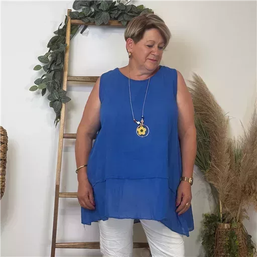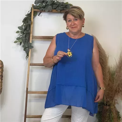 Coup de coeur de notre équipe pour nos clientes “Jolies Formes”. D’une belle ampleur, ce débardeur bi-matière à la coupe trapèze sans manche a un joli col rond. Ce débardeur en coton, se portera en mode casual sur unjean voggo ou un legging. Vendu avec un collier fantaisie