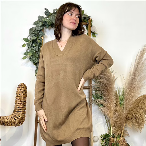 K010- Robe pull col V – Confort & style pour l’hiver (camel)