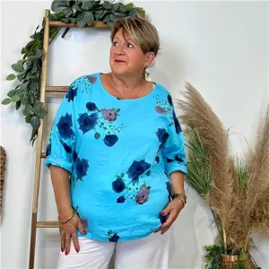 Z151- Tunique coton « FLEURS » (Gt) 🇮🇹 (bleu turquoise)